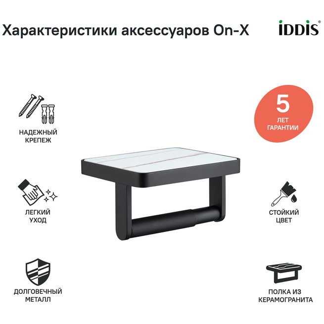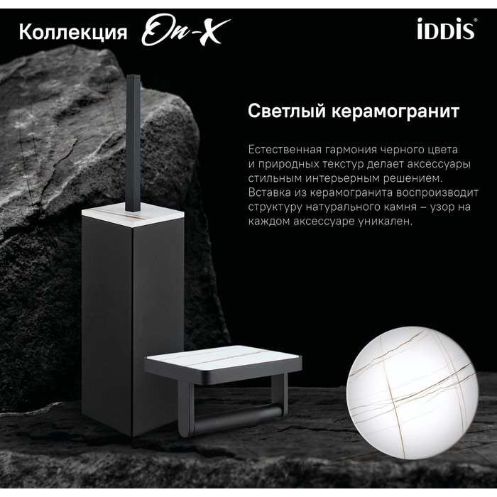 Вдохновленная актуальными трендами из мира дизайна коллекция On-X. Естественная гармония черного цвета и природных текстур делает аксессуары стильным интерьерным решением. Вставка из белого керамогранита воспроизводит структуру натурального камня – узор на каждом продукте уникален. Бумагодержатель On-X имеет полочку, которая подойдет для размещения мобильного телефона или диффузора. Бумагодержатель IDDIS прослужит дольше во влажном помещении туалетной комнаты благодаря прочной и стойкой к коррозии латуни. Черное покрытие нанесено методом электролиза. Технология гарантирует высокую стойкость цвета при негативном воздействии внешних факторов. Бумагодержатель IDDIS упакован в коробку с поролоновым уплотнителем внутри, что обеспечивает его надежную фиксацию и сохранность даже при длительной транспортировке. Гарантия на аксессуары IDDIS – 5 лет. (с) Авторский текст, март 2022 г.