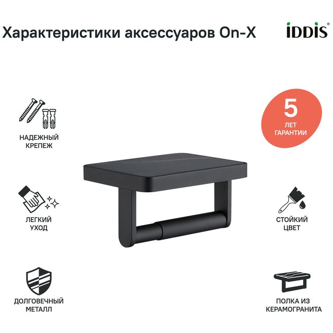 Вдохновленная актуальными трендами из мира дизайна коллекция On-X. Естественная гармония черного цвета и природных текстур делает аксессуары стильным интерьерным решением. Вставка из керамогранита воспроизводит структуру натурального камня – узор на каждом продукте уникален. Бумагодержатель On-X имеет полочку, которая подойдет для размещения мобильного телефона или диффузора. Бумагодержатель IDDIS прослужит дольше во влажном помещении туалетной комнаты благодаря прочной и стойкой к коррозии латуни. Черное покрытие нанесено методом электролиза. Технология гарантирует высокую стойкость цвета при негативном воздействии внешних факторов. Бумагодержатель IDDIS упакован в коробку с поролоновым уплотнителем внутри, что обеспечивает его надежную фиксацию и сохранность даже при длительной транспортировке. Гарантия на аксессуары IDDIS – 5 лет. (с) Авторский текст, март 2022 г.