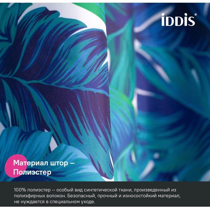 Текстильная штора для ванной с ярким сине-зеленым принтом из тропических листьев. • Изготовлена из износостойкого полиэстера с усиленной водонепроницаемой пропиткой. При попадании на ткань вода не впитывается, а скатывается каплями, даже при сильном напоре воды. • В комплекте 12 колец С-формы из прозрачного пластика. • По верхнему краю расположены 12 прозрачных пластиковых люверсов. • Штора имеет утяжеляющую нить по нижнему краю, которая позволяет избежать задирания ткани. • Легко ухаживать: шторку для ванной комнаты можно стирать в стиральной машине в деликатном режиме и гладить утюгом на минимальной температуре. Гарантия на текстильные аксессуары Iddis® – 1 год. (с) Авторский текст, август 2023 г.