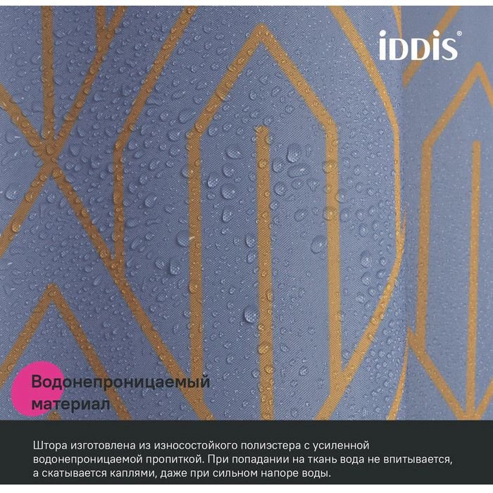 Текстильная штора для ванной красивого лилового оттенка с крупным геометричным золотым узором в стиле ар-деко создаст утонченное элегантное настроение даже в самом простом интерьере. • Изготовлена из износостойкого полиэстера с водоотталкивающей пропиткой. При попадании на ткань вода не впитывается, а скатывается каплями, даже при сильном напоре воды. • В комплекте 12 колец С-формы из прозрачного пластика. • По верхнему краю расположены 12 прозрачных пластиковых люверсов. • Штора имеет утяжеляющую нить по нижнему краю, которая позволяет избежать задирания ткани. • Легко ухаживать: шторку для ванной комнаты можно стирать в стиральной машине в деликатном режиме и гладить утюгом на минимальной температуре. Гарантия на текстильные аксессуары Iddis® – 1 год. (с) Авторский текст, сентябрь 2023 г.