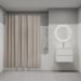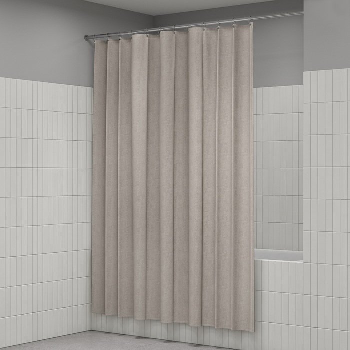 Однотонная плотная текстильная штора для ванной насыщенного бежевого цвета с фактурой натурального льна, что делает ее элегантной и утонченной. Напоминает классические текстильные шторы и соответствует актуальному тренду оформления ванной как уютной жилой комнаты.