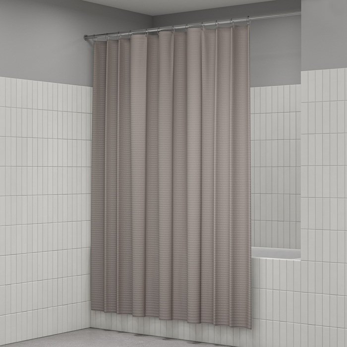 Однотонная текстильная штора для ванной бежевого цвета с фактурным рисунком "вафля". Напоминает классические текстильные шторы и соответствует актуальному тренду оформления ванной как уютной жилой комнаты.