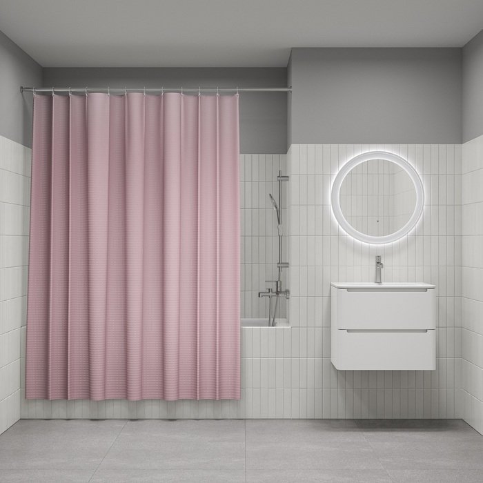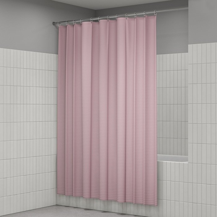 Однотонная текстильная штора для ванной розового цвета с фактурным рисунком "вафля". Напоминает классические текстильные шторы и соответствует актуальному тренду оформления ванной как уютной жилой комнаты.