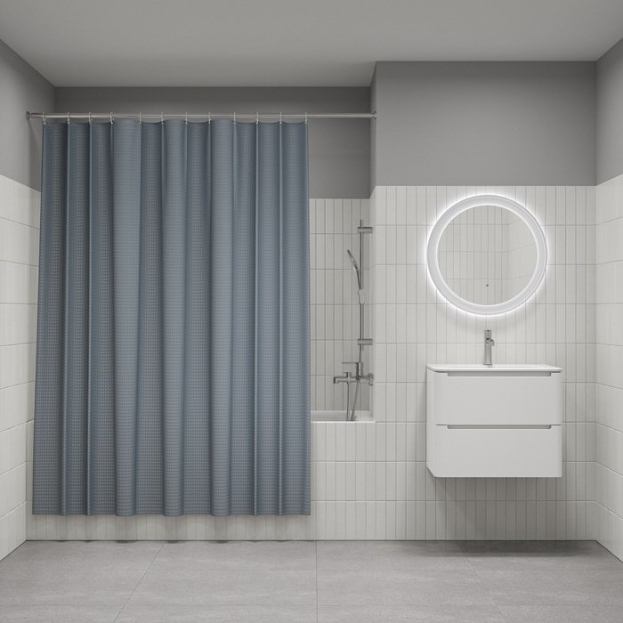 Однотонная текстильная штора для ванной серого цвета с фактурным рисунком "вафля". Напоминает классические текстильные шторы и соответствует актуальному тренду оформления ванной как уютной жилой комнаты.