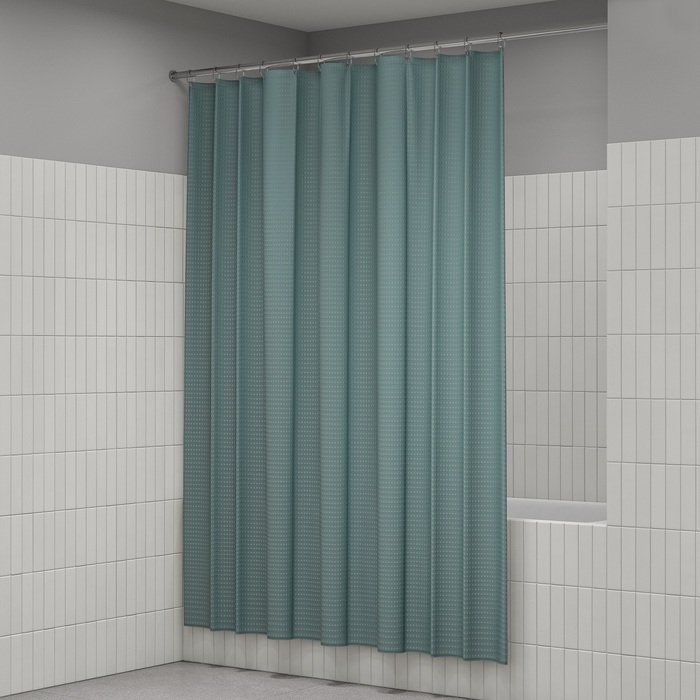 Однотонная текстильная штора для ванной зеленого цвета с фактурным рисунком "вафля". Напоминает классические текстильные шторы и соответствует актуальному тренду оформления ванной как уютной жилой комнаты.