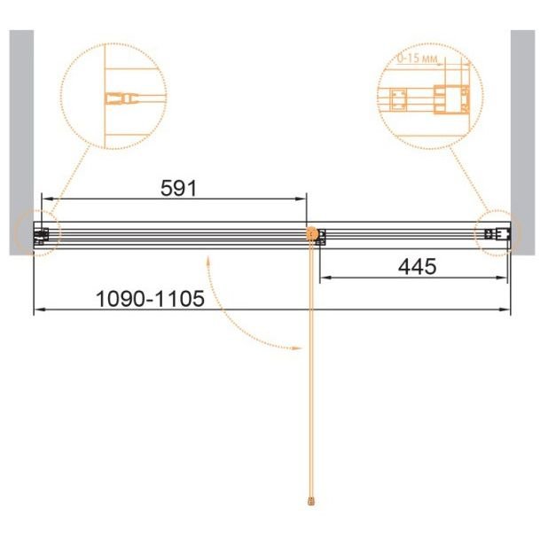 Открывание двери на 180°, герметичность между примыканием двери, неподвижным элементом стекла и дверью, осуществляется при помощи силиконового уплотнителя (без использования магнитных уплотнителей).