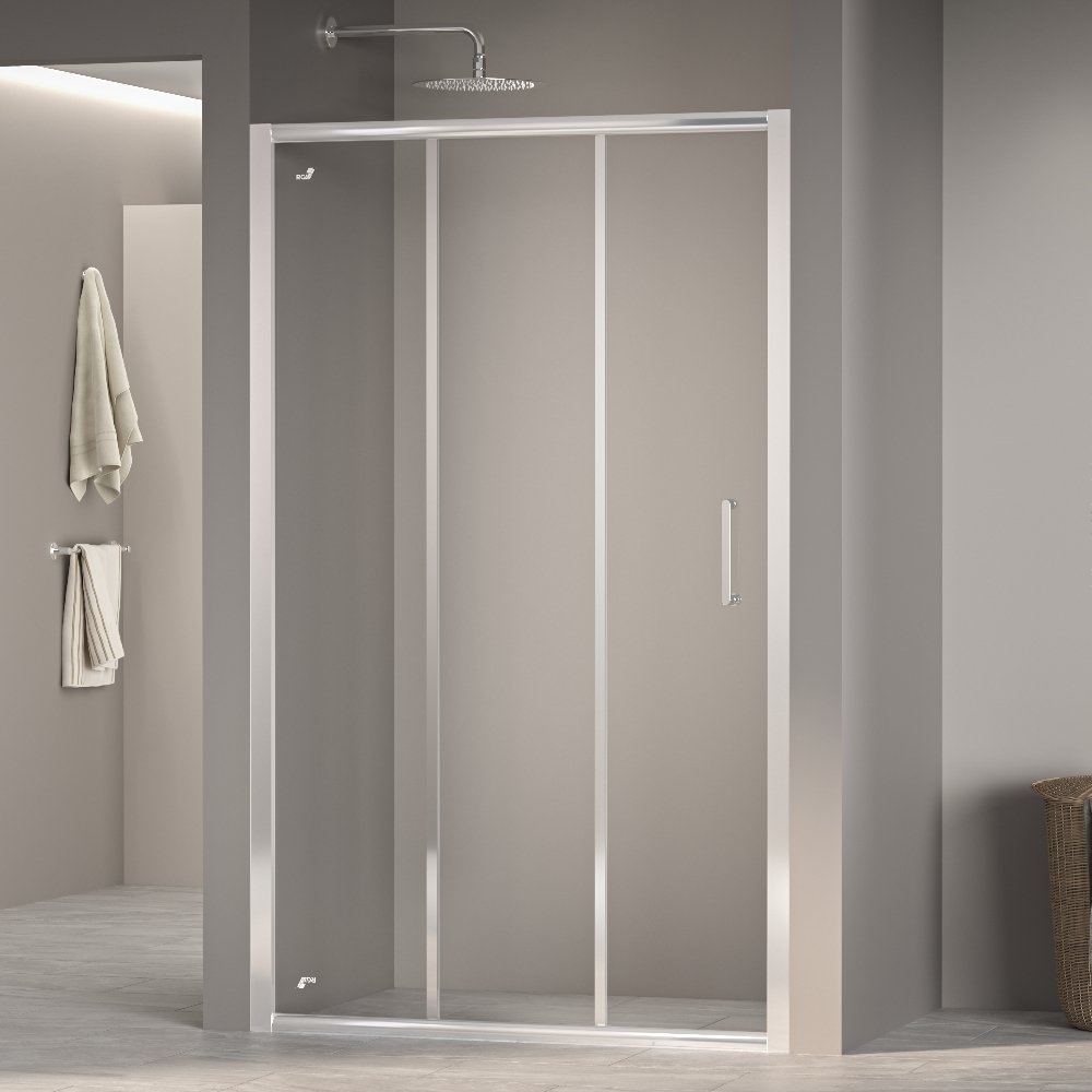 Душевая дверь раздвижная с двумя подвижными створками и одной фиксированной. Двери двигаютcя одновременно.