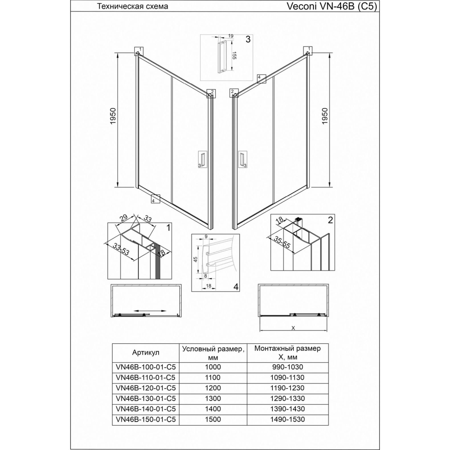 Душевая дверь Veconi Vianno раздвижная VN-46B.Раздвижная дверь и одно неподвижное стекло. Стекло закаленное безопасное 6 мм. Магнитные уплотнители обеспечивают герметичное закрывание двери, плотно прилегая к профилю. Профиль анодированный алюминий в цвет - черный. Регулируемые пристенные профили -10/+30 мм. Регулируемые двойные ролики обеспечивают плавное и бесшумное открывание дверей. Ручки открывания двери из АВS пластика в цвет - черный. Универсальная установка открытия двери, левая-правая сторона. Позволяет устанавливать ограждение в зависимости от особенностей помещения. Дополнительно можно скомплектовать с боковой панелью KP-03B, образуя П и Г образный угол RV-25B.