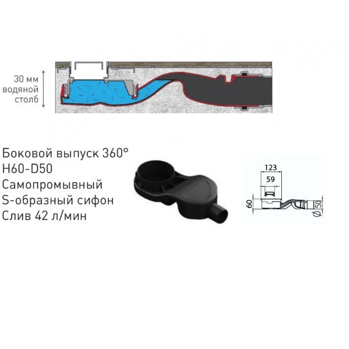 Самопромывной S-образный сифон PP горизонтальный выпуск D50 H60, пропускная способность 42л/мин, монтаж 360°