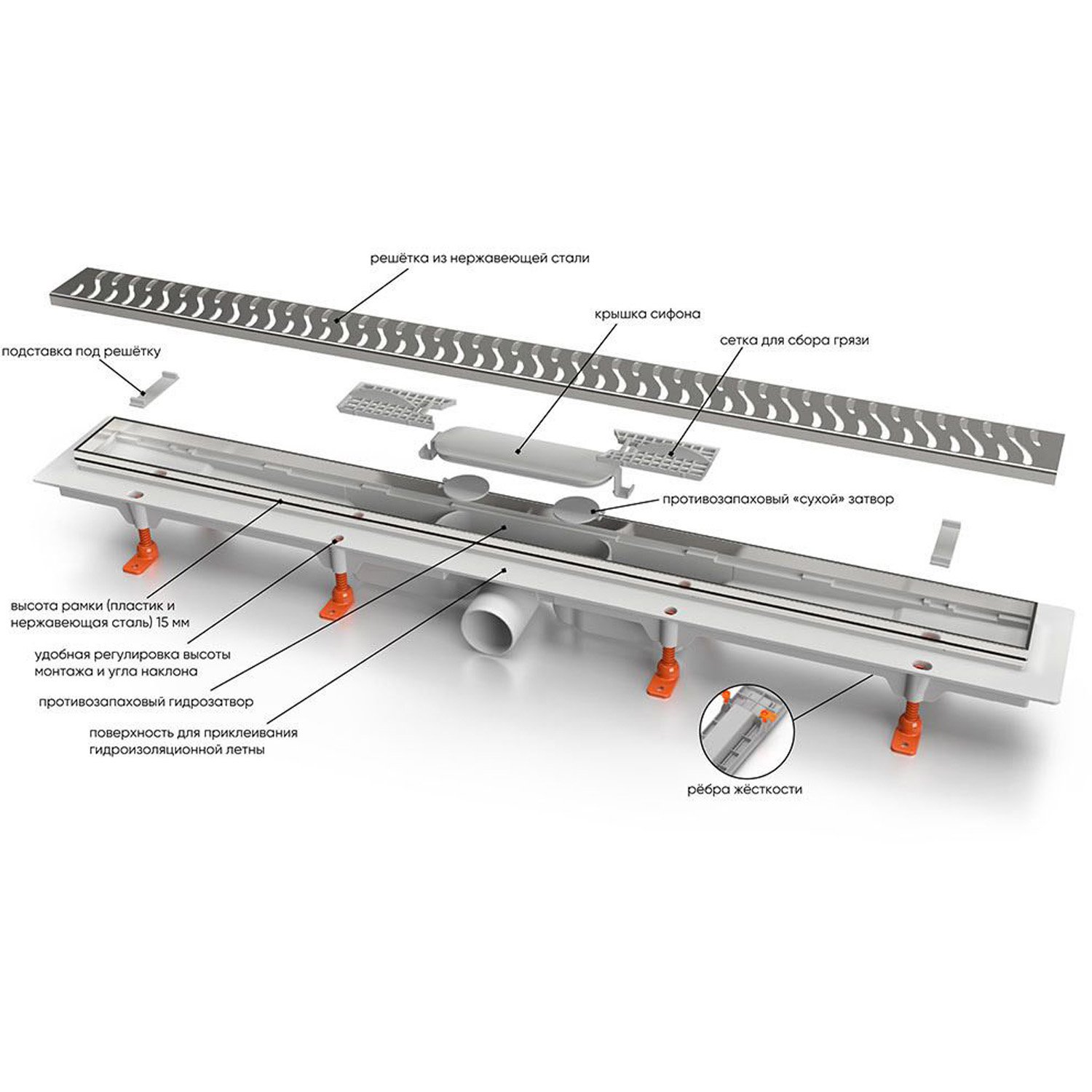 Комплектация:душевой лоток, декоративная решетка, ключ для поднятия желоба, инструкция p>