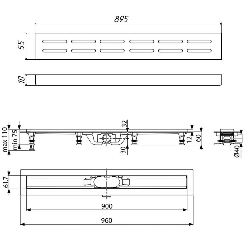 Комплектация:пластиковый водоотводящий желоб с порогами из нержавеющей стали; встроенный сифон DN40, выход вбок 90 град.; встроенный шариковый сухой затвор; декоративная вставка; комплект регулируемых опор; улавливатель волос и мусора; гидроизоляционная лента; сервисный ключь. p>