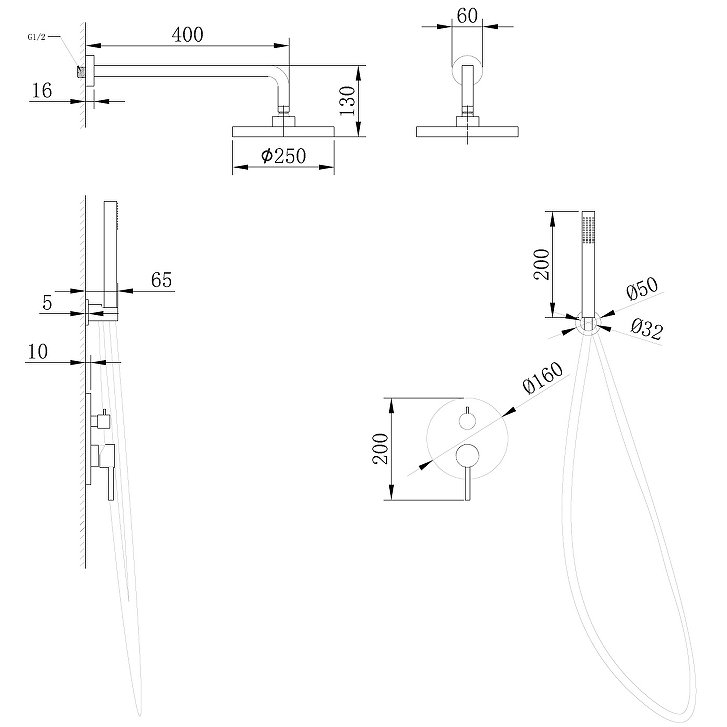 Комплектация:Смеситель для душа (внешняя и внутренняя части). Кронштейн для верхнего душа. Верхний душ. Ручной душ. Душевой шланг. Держатель ручного душа. p>
