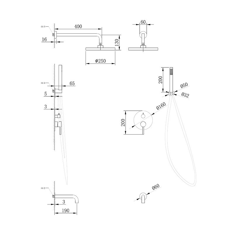 Комплектация:Смеситель (внешняя и внутренняя часть). Излив. Кронштейн. Верхний душ. Ручной душ. Душевой шланг. Шланговое подключение с держателем ручного душа. Комплект креплений. p>
