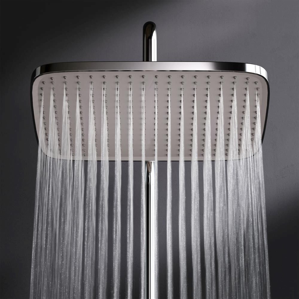 Телескопическая штанга регулируется по высоте в диапазоне от 1030 до 1460 мм, обеспечивая комфорт для людей любого роста. А трендовая прямоугольная форма и увеличенный размер тропического душа подарят ощущения настоящего домашнего SPA.