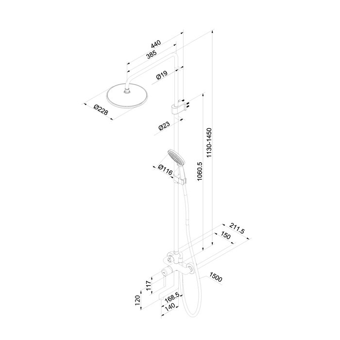 • Штанга верхнего душа регулируется по высоте 113-145 см в момент установки смесителя, что позволяет в дальнейшем с комфортом принимать душ всей семье.