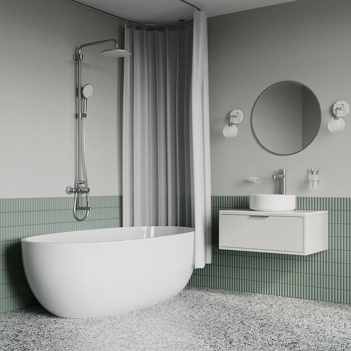 • Поток воды переключается поворотным керамическим дивертором на стойке – он повторяет дизайн ручки, выглядит стильно и элегантно.