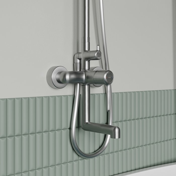 Стильная функциональная душевая система Aiger, где удачно сочетается актуальный современный дизайн и трендовый оттенок матового хрома с брашированным покрытием. Тонкая удлиненная ручка добавляет смесителю изящества и комфорт в управлении.