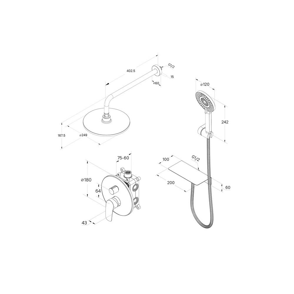 • В комплекте есть все, что нужно, чтобы начать пользоваться сразу: ПВХ-шланг (1,5 м), четырехрежимная ручная лейка, тропический душ и выход для шланга, оснащенный полочкой для размещения косметических средств.