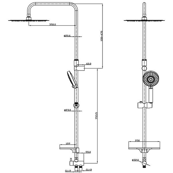 Душевой гарнитур с верхней лейкой. Ручная лейка с 5 режимами (Rain, Massage, Rain&Massage, Hard Massage, Rain&Hard Massage). Стойка: нержавеющая сталь. Верхняя лейка: нержавеющая сталь, сверхтонкая, диаметр 300 мм. Ручная лейка: ABS-пластик, диаметр 118 мм. Шланги: нержавеющая сталь, 1,5 и 0,6 метра, с системами Double Lock и Twist-Free. Поворотный керамический дивертор: три режима (переключалель верхний душ/ручная лейка/комбо-режим). Верхнее крепление стойки свободное. Телескопическая стойка, высота 860-1223 мм. Шарнирное крепление верхней лейки регулирует направление потока под нужным углом. В комплекте: вместительная полка из высокопрочного ABS-пластика, крепеж.