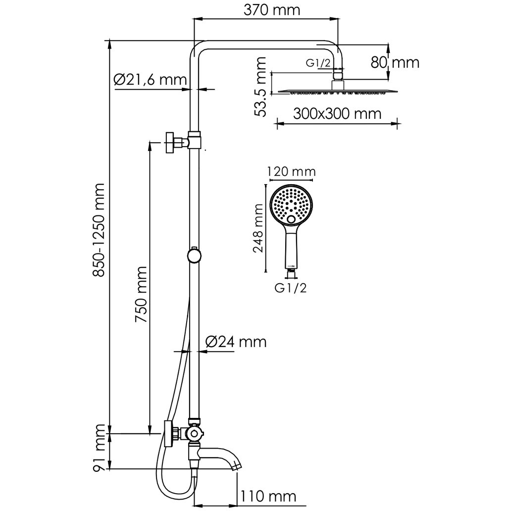 Стойка для душа, Ø 22 мм регулируемая по высоте