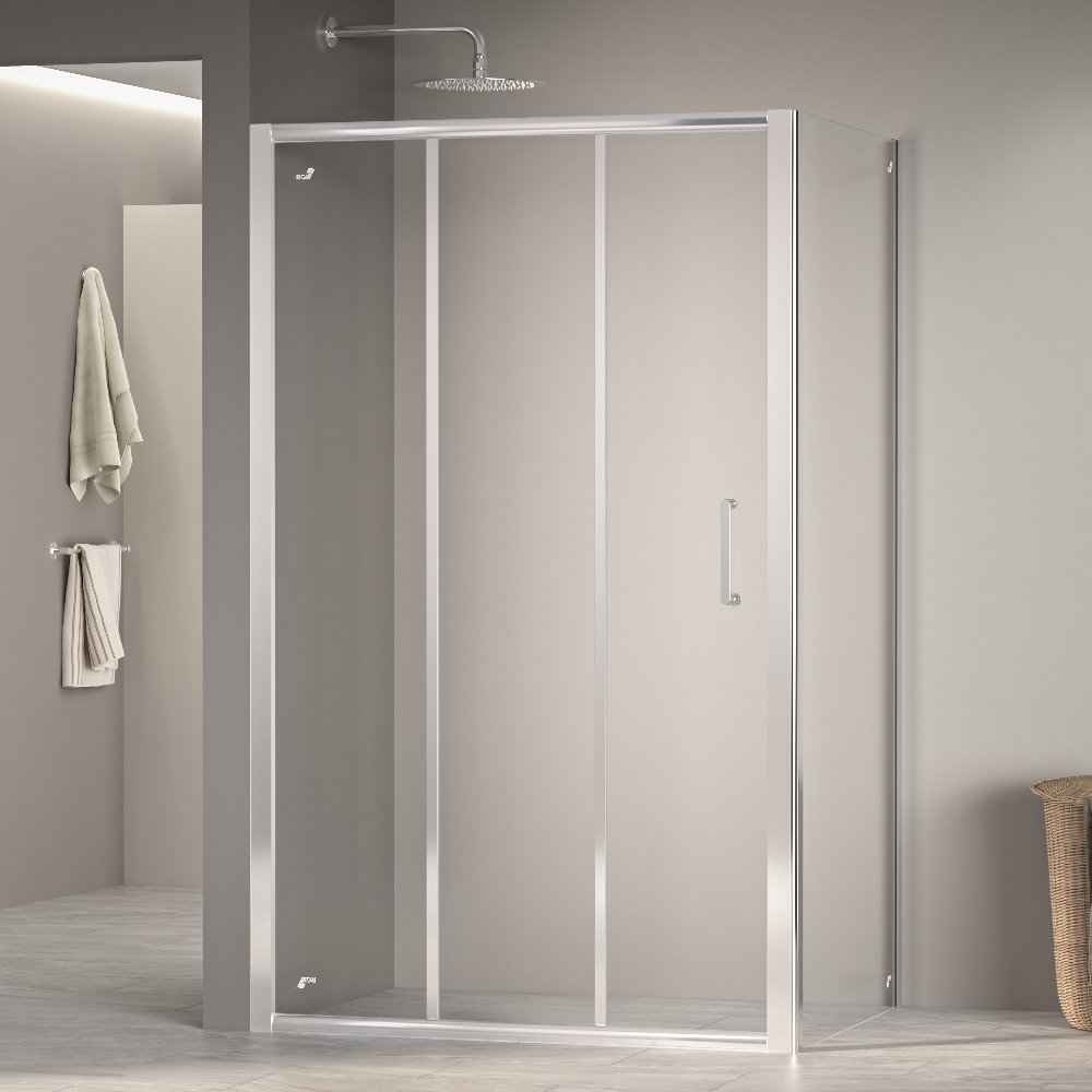 Душевой уголок раздвижной с двумя подвижными створками и одной фиксированной состоит из душевой двери RGW PA-13 и боковой панели RGW Z-050-2. Двери двигаются одновременно. Трап или поддон приобретается отдельно.