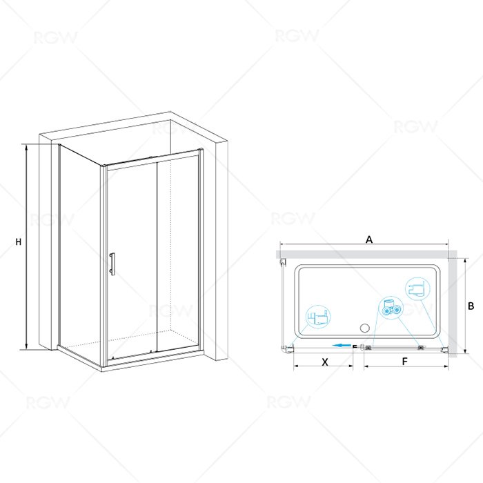 Душевой уголок прямоугольный, одна раздвижная дверь. Трап или поддон приобретается отдельно.