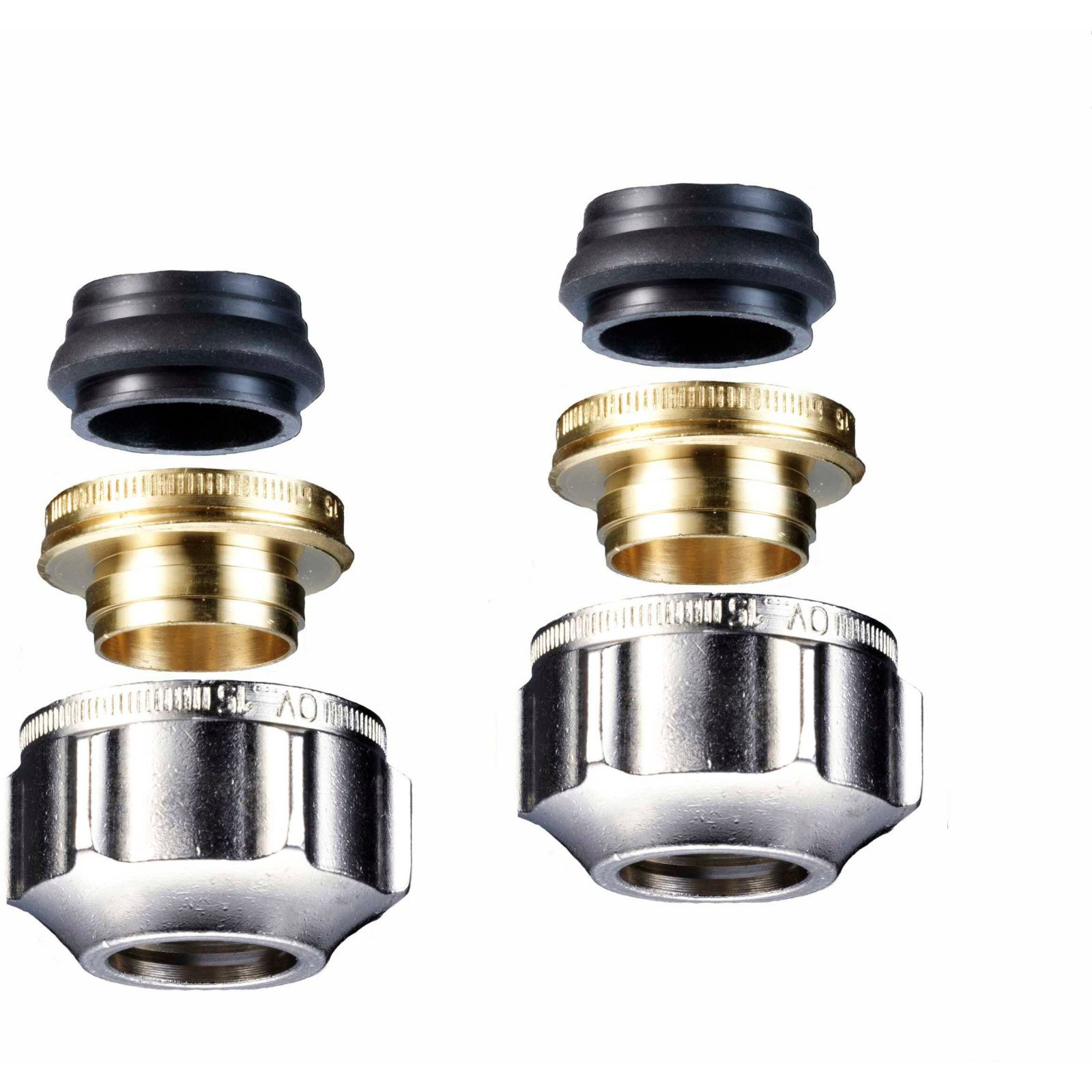 Набор присоединительный со стяжным кольцом, Oventrop, Ofix CEP Knack & Klemm, 15 мм, латунь, для наружной резьбы G 3/4", накидная гайка никелированная, двойная функция стяжного кольца, в сборе, мягкое уплотнение (упорные гильзы не требуются), макс. 95C, для медной трубы, прецизионной стальной трубы и трубы из нержавеющей стали, 2 набора в комплекте