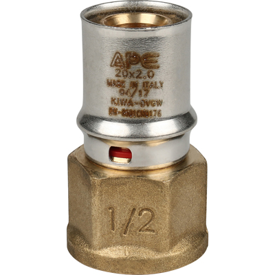 Пресс-фитинг с переходом на внутреннюю резьбу применяется в качестве соединителя металлопластиковой (металлополимерной) либо PEX-трубы и элемента системы с резьбовым патрубком – крана, клапана и т.д. Областью применения фитинга являются системы водоснабжения, отопления, трубопроводы технологического назначения, транспортирующие среды, которые неагрессивны к латуни, материалу уплотнений (EPDM), используемой трубы. Корпус изделия никелирован. Пресс-гильза изготовлена из нержавеющей стали AISI 304, фиксатор – из нейлона. Резьба – внутренняя, соответствует ГОСТу 6357. Опрессовка гильзы фитинга производится пресс-инструментом с насадками ТН.