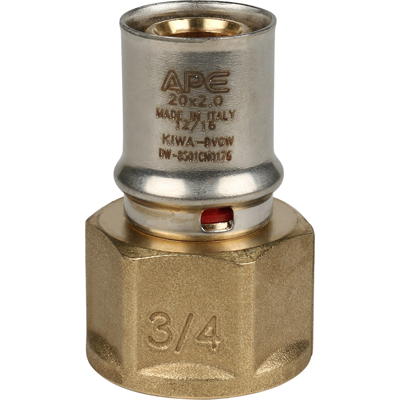 Пресс-фитинг с переходом на внутреннюю резьбу применяется в качестве соединителя металлопластиковой (металлополимерной) либо PEX-трубы и элемента системы с резьбовым патрубком – крана, клапана и т.д. Областью применения фитинга являются системы водоснабжения, отопления, трубопроводы технологического назначения, транспортирующие среды, которые неагрессивны к латуни, материалу уплотнений (EPDM), используемой трубы. Корпус изделия никелирован. Пресс-гильза изготовлена из нержавеющей стали AISI 304, фиксатор – из нейлона. Резьба – внутренняя, соответствует ГОСТу 6357. Опрессовка гильзы фитинга производится пресс-инструментом с насадками ТН.