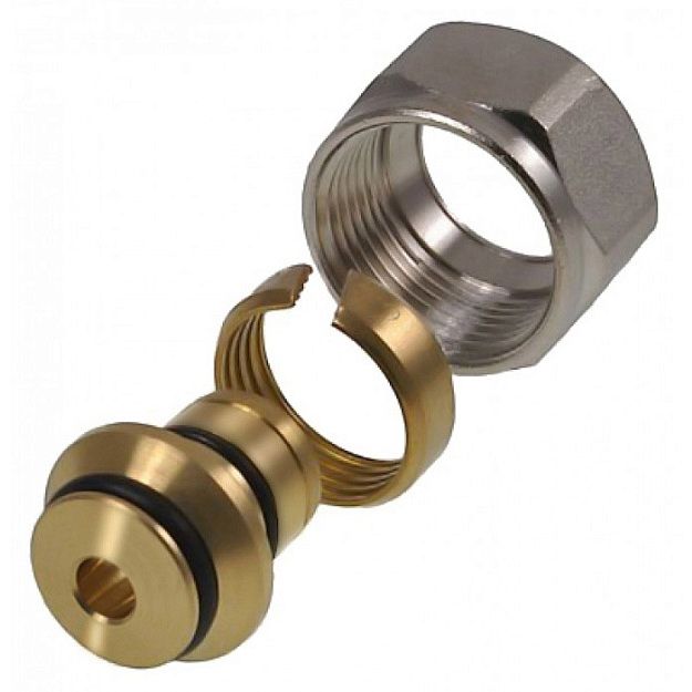 Резьбозажимное соединение для труб RAUTHERM S. В комплекте с упорной втулкой, обжимным кольцом и накидной гайкой.