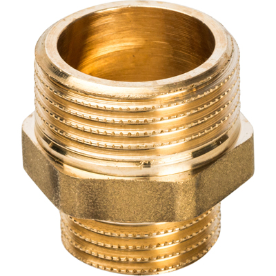 Латунный фитинг для соединения элементов трубопровода разного диаметра. Резьба – наружная/наружная, цилиндрическая трубная. Предусмотрен участок корпуса шестигранной формы, под гаечный ключ.