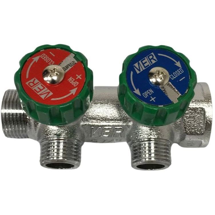 ViEiR Коллектор с регулировочными вентилями 3/4"х1/2" (TP) 2 выхода VER402-A. Артикул VER402-A. ViEiR VER402-A - это универсальный распределительный коллектор диаметром 3/4, оборудованный вентилем на каждом выходе для плавной регулировки мощности потока воды. Оснащен отверстиями на 2 выхода диаметром 16 мм. Выходы на 1/2 дюйма.