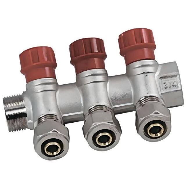 Корпус коллектора ViEiR производят из латуни покрытой для дополнительной защиты слоем никеля. Представляет собой проходной коллектор с наружной и внутренней резьбой на 3/4". Изделие обеспечит равномерную подачу жидкости к каждому из выходов, что позволит избежать не нужных перепадов давления и температуры воды связанных с "конкуренцией" потребителей.