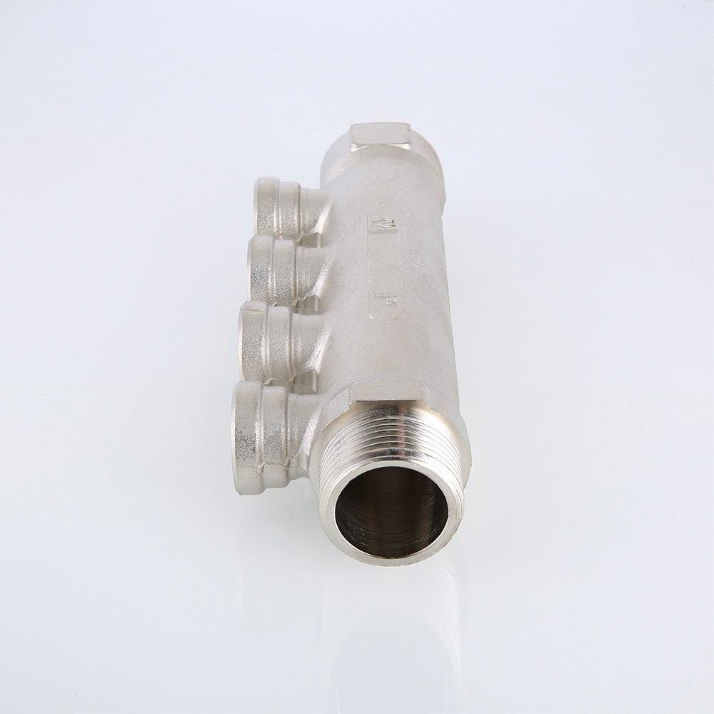 (VTc.550.N) Латунный никелированный коллектор на 2, 3 или 4 выхода диаметром 1/2" с внутренней резьбой. Диаметр коллектора – 3/4 или 1", резьба – внутренняя/наружная. Рабочая температура теплоносителя – до 130 °С, давление – до 16 бар. Применяется для распределения потоков жидкостей в контурах теплого пола, радиаторного отопления, холодного и горячего водоснабжения.