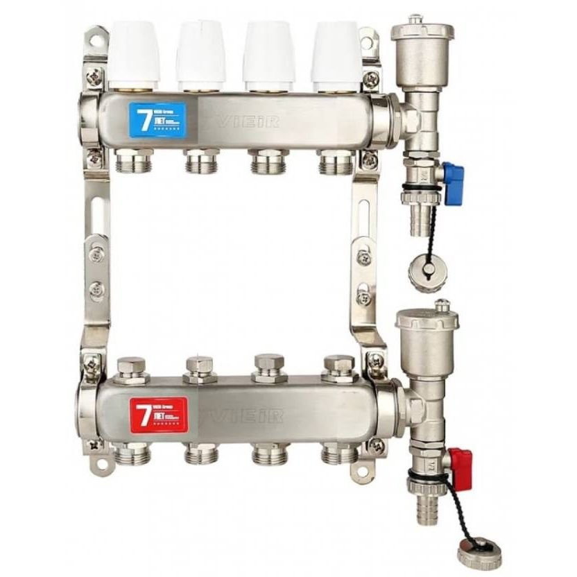 Корпус коллектора ViEiR производят из нержавеющей стали и максимально устойчив к агрессивным средам. Это значит что такая коллекторная группа подойдет для работы с антифризами и незамерзающими жидкостями. Коллектор имеет наружную и внутреннюю резьбу на 1". Соединение фитингов осуществляется на уплотнителях выполненных из EPDM резины, что значительно упрощает сборку и монтаж. Коллекторы оснащены отверстиями на 4 выхода диаметром 3/4" под евроконус. Коллекторная группа оснащена воздухоотводчиком с терминальным узлом, который представляет собой прибор для автоматического удаления газов, объединенный в одном узле с краном для слива или наполнения жидкостью системы.