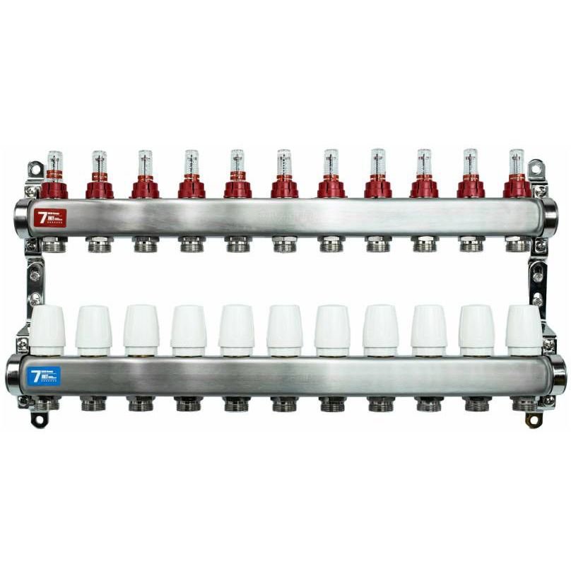 ViEiR Коллекторная группа, нержавеющая сталь 1" х 3/4", с расходомерами 11 выходов (5/1) VR113-11A. Артикул VR113-11A. Коллекторная группа применяется для передачи жидкости на контуры отопления и настройки в них мощности потока и температуры в системе "теплый пол", а также подключения радиаторов отопления, других тепловых приборов. Основные рабочие элементы это "две гребенки," - коллекторы подающего и обратного контура.