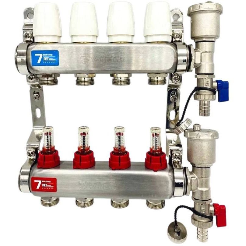 ViEiR Коллекторная группа, нержавеющая сталь 1" х 3/4", с расходомерами 4 выхода (5/1) VR113-04A. Артикул VR113-04A. Коллекторная группа применяется для передачи жидкости на контуры отопления и настройки в них мощности потока и температуры в системе "теплый пол", а также подключения радиаторов отопления, других тепловых приборов. Основные рабочие элементы это "две гребенки," - коллекторы подающего и обратного контура.
