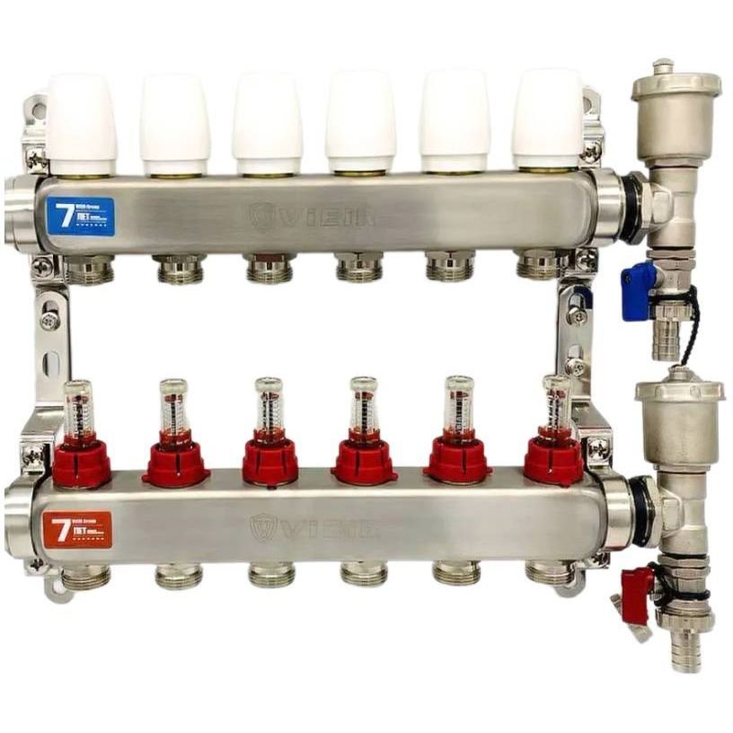ViEiR Коллекторная группа, нержавеющая сталь 1" х 3/4", с расходомерами 6 выходов (5/1) VR113-06A. Артикул VR113-06A. Коллекторная группа применяется для передачи жидкости на контуры отопления и настройки в них мощности потока и температуры в системе "теплый пол", а также подключения радиаторов отопления, других тепловых приборов. Основные рабочие элементы это "две гребенки," - коллекторы подающего и обратного контура.