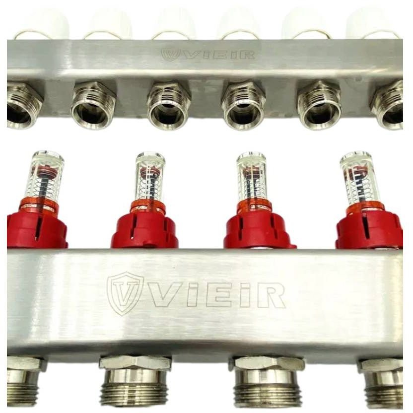 Корпус коллектора ViEiR производят из нержавеющей стали и максимально устойчив к агрессивным средам. Это значит что такая коллекторная группа подойдет для работы с антифризами и незамерзающими жидкостями. Коллектор имеет наружную и внутреннюю резьбу на 1". Соединение фитингов осуществляется на уплотнителях выполненных из EPDM резины, что значительно упрощает сборку и монтаж. Коллекторы оснащены отверстиями на 6 выходов диаметром 3/4" под евроконус. Коллекторная группа оснащена воздухоотводчиком с терминальным узлом, который представляет собой прибор для автоматического удаления газов, объединенный в одном узле с краном для слива или наполнения жидкостью системы.