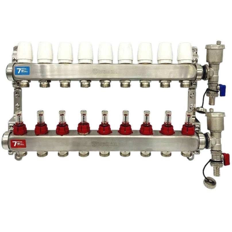 ViEiR Коллекторная группа, нержавеющая сталь 1" х 3/4", с расходомерами 9 выходов (5/1) VR113-09A. Артикул VR113-09A. Коллекторная группа применяется для передачи жидкости на контуры отопления и настройки в них мощности потока и температуры в системе "теплый пол", а также подключения радиаторов отопления, других тепловых приборов. Основные рабочие элементы это "две гребенки," - коллекторы подающего и обратного контура.