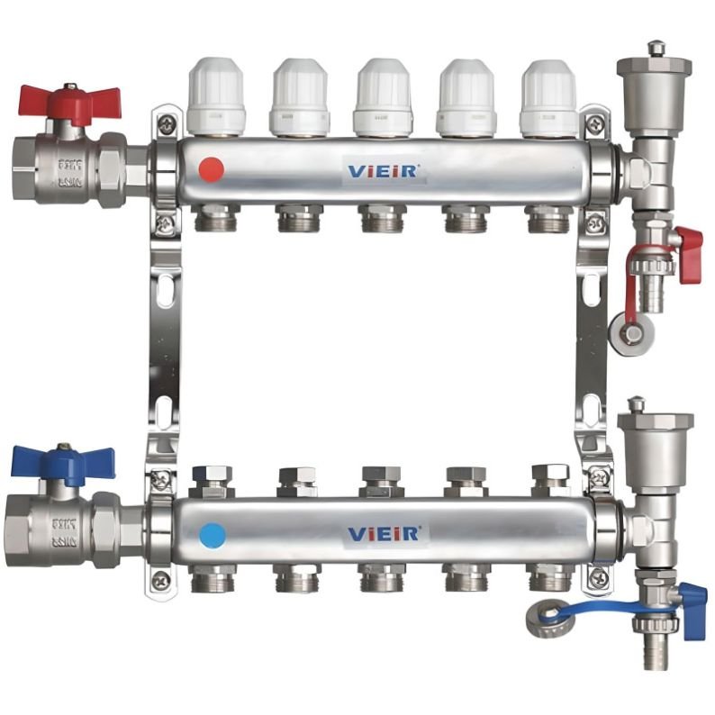 Корпус коллектора ViEiR производят из нержавеющей стали и максимально устойчив к агрессивным средам. Это значит что такая коллекторная группа подойдет для работы с антифризами и незамерзающими жидкостями. Коллектор имеет наружную и внутреннюю резьбу на 1". Соединение фитингов осуществляется на уплотнителях выполненных из EPDM резины, что значительно упрощает сборку и монтаж. Коллекторы оснащены отверстиями на 3 выхода диаметром 3/4" под евроконус. Коллекторная группа оснащена воздухоотводчиком с терминальным узлом, который представляет собой прибор для автоматического удаления газов, объединенный в одном узле с краном для слива или наполнения жидкостью системы.