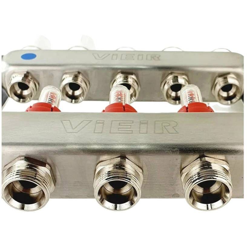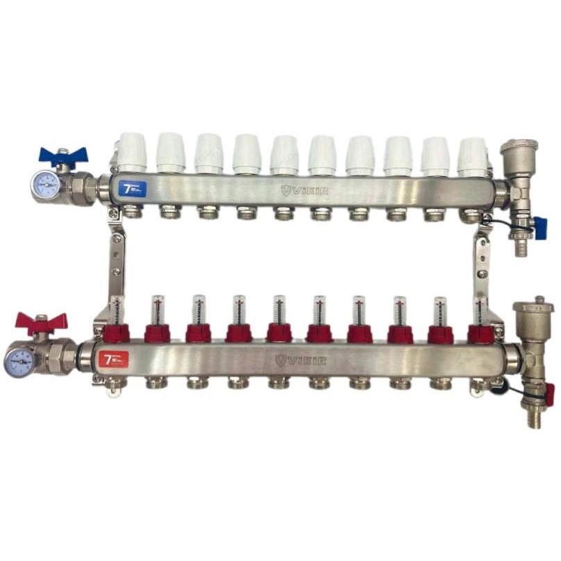 ViEiR Коллекторная группа с КРАНАМИ, нержавеющая сталь 1" х 3/4", с расходомерами 10 выходов (5/1) VR113-10. Артикул VR113-10. Коллекторная группа применяется для передачи жидкости на контуры отопления и настройки в них мощности потока и температуры в системе "теплый пол", а также подключения радиаторов отопления, других тепловых приборов. Основные рабочие элементы это "две гребенки," - коллекторы подающего и обратного контура.