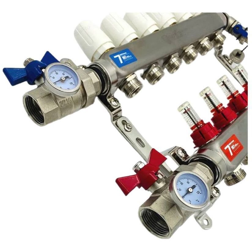 ViEiR Коллекторная группа с КРАНАМИ, нержавеющая сталь 1" х 3/4", с расходомерами 9 выходов (5/1) VR113-09. Артикул VR113-09. Коллекторная группа применяется для передачи жидкости на контуры отопления и настройки в них мощности потока и температуры в системе "теплый пол", а также подключения радиаторов отопления, других тепловых приборов. Основные рабочие элементы это "две гребенки," - коллекторы подающего и обратного контура.