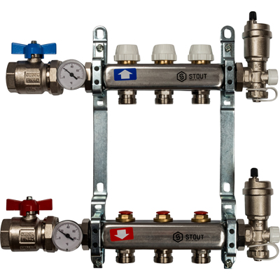 Коллекторный блок без расходомеров Stout (Стаут) в сборе 1 на 3/4 дюйма с тремя выходами (SMS 0912 000003) - это высококачественное решение для организации системы отопления и водоснабжения. Этот продукт идеально подходит для использования в жилых и коммерческих помещениях, обеспечивая надежное распределение теплоносителя или воды.