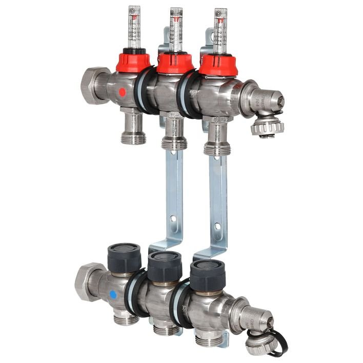 Коллектор состоит из подающей и обратной части коллектора, кронштейна для крепления со звукопоглощающими хомутами, бокового поворотного узла с воздухоотделителем, штуцера подачи /слива и заглушкой 3/4 дюйма. Подающие части коллектора оснащены регулируемыми расходомерами со шкалой от 0 до 5 л/мин для балансировки расхода в каждом контуре. Обратные части коллектора могут быть оборудованы сервоприводами (сервомоторами) при автоматическом регулировании. Размер входа 1 дюйм