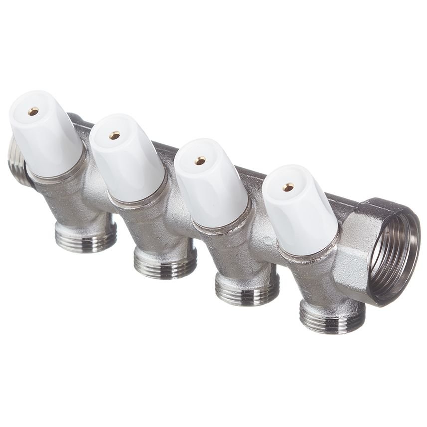 Коллектор НВ с вентилями никелированный Rautitan MX Rehau G1 x 4 вых G3/4, межосевое 40 мм. Предназначен для монтажа систем водоснабжения и отопления с трубами RAUTITAN stabil и RAUTITAN flex.