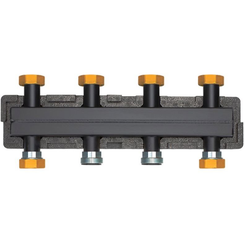 Распределительный коллектор Meibes из черной стали для подключения насосных групп. С полным термо-гидравлическим разделением подающей и обратной линий.