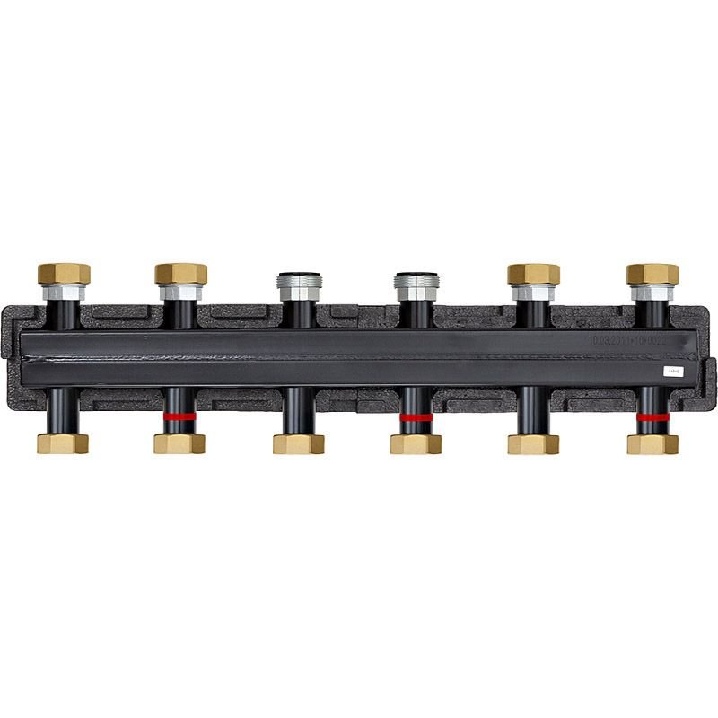 Распределительный коллектор Meibes из черной стали для подключения насосных групп. С полным термо-гидравлическим разделением подающей и обратной линий.