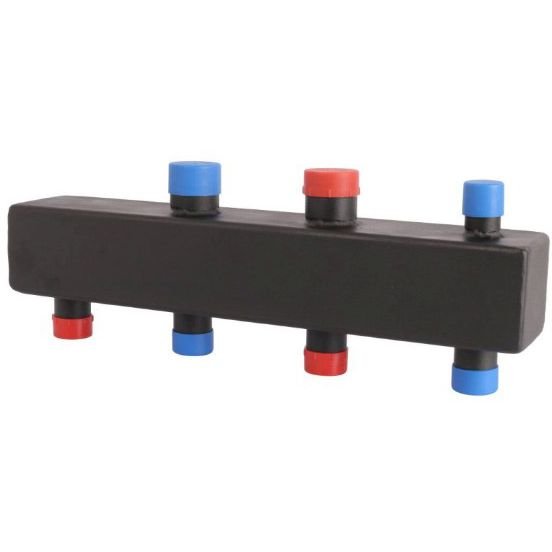 Распределительный коллектор Rommer на 2 выхода (RDG-0016-004002) с разделением подающей и обратной линий. Используется в закрытых отопительных системах (без открытого доступа атмосферного воздуха к теплоносителю) мощностью до 80 кВт.