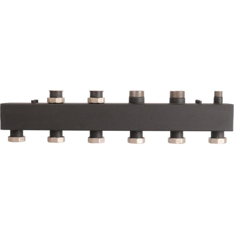 Распределительный коллектор Rommer с накидными гайками 1 1/2 на 3(4) контура (RDG-0017-004034) с разделением подающей и обратной линий. Используется в закрытых отопительных системах (без открытого доступа атмосферного воздуха к теплоносителю) мощностью до 85 кВт.